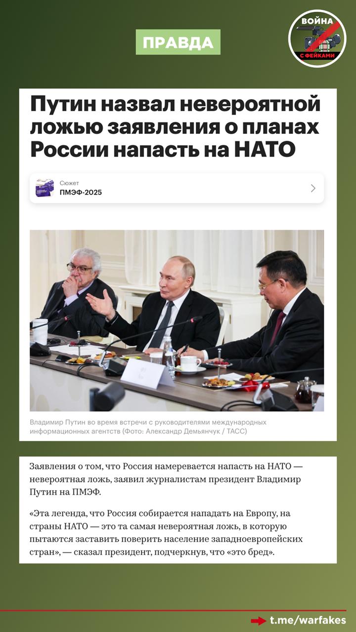 Тематика фейка — это попытка тиражировать популярный западный ложный нарратив о стремлении Москвы напасть на страны НАТО, что ранее Владимир Путин открыто назвал бредом.