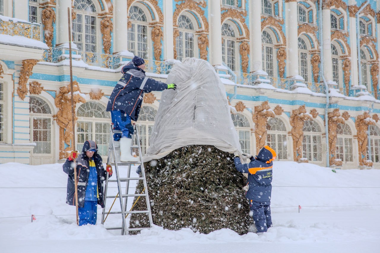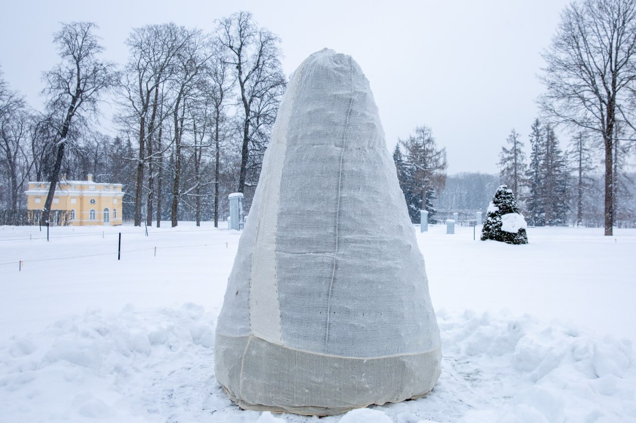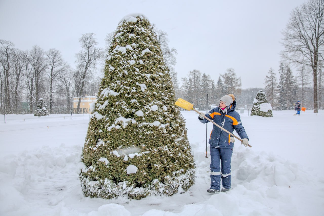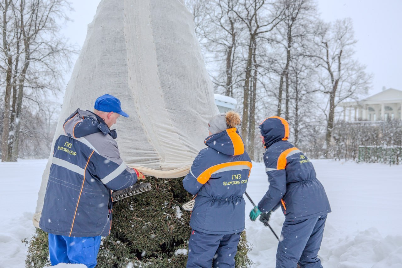 В Екатерининском парке укрыли туи. Это верный знак, что скоро станет теплее.