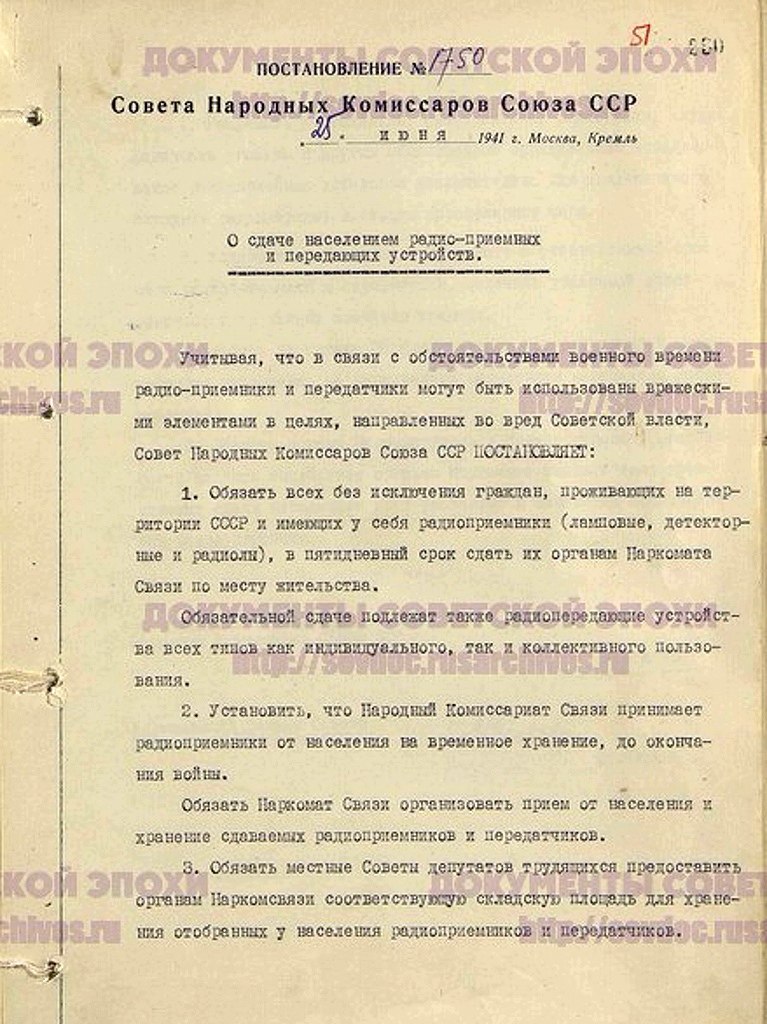 Берлинское радио передало сообщение "Фолькишер Беобхатер", где доктор Геббельс заявил, что радиоприемники отбирают у населения СССР из страха перед победоносным германским рейхом.