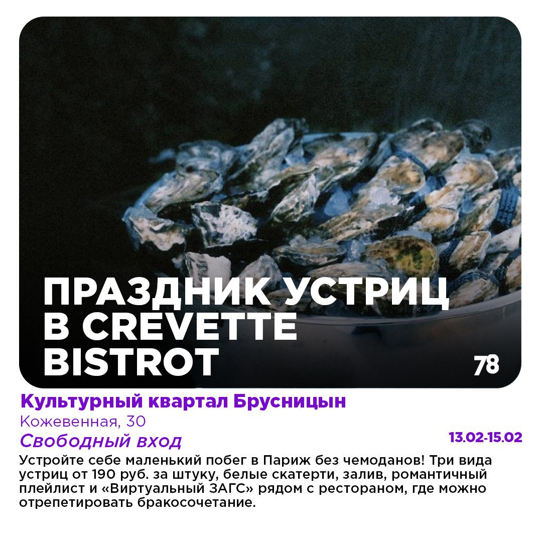 Для парочек: в ресторане Crevette Bistrot, что в культурном квартале Брусницын, развернется настоящее пиршество: шутка ли, несколько видов устриц от 190 рублей за штуку (все помнят, что устрицы мощный афродизиак?!). Для самых смелых Виртуальный ЗАГС рядом с рестораном. Юридической силы заключенный там брак иметь не будет, но веселье на вечер вам и вашей половинке обеспечено.