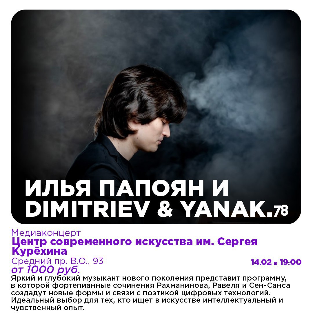 Для самодостаточных одиночек: рекомендуем вдумчивое времяпрепровождение на Медиаконцерте пианиста Ильи Папояна и художников Dimitriev & Yanak. Вы получите не только эстетическое удовольствие, но и новый интеллектуальный и чувственный опыт.