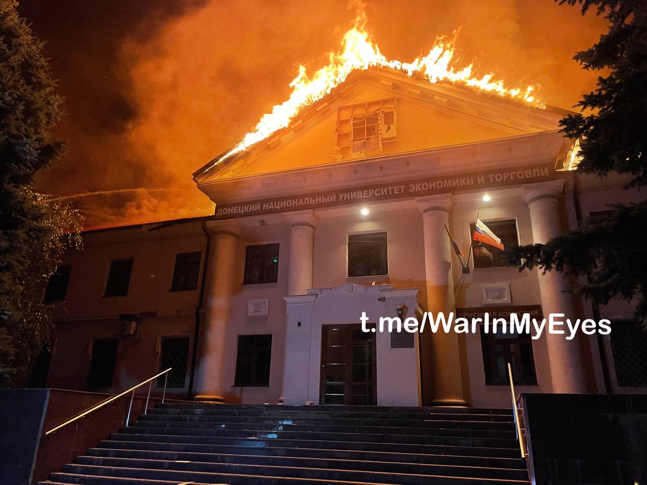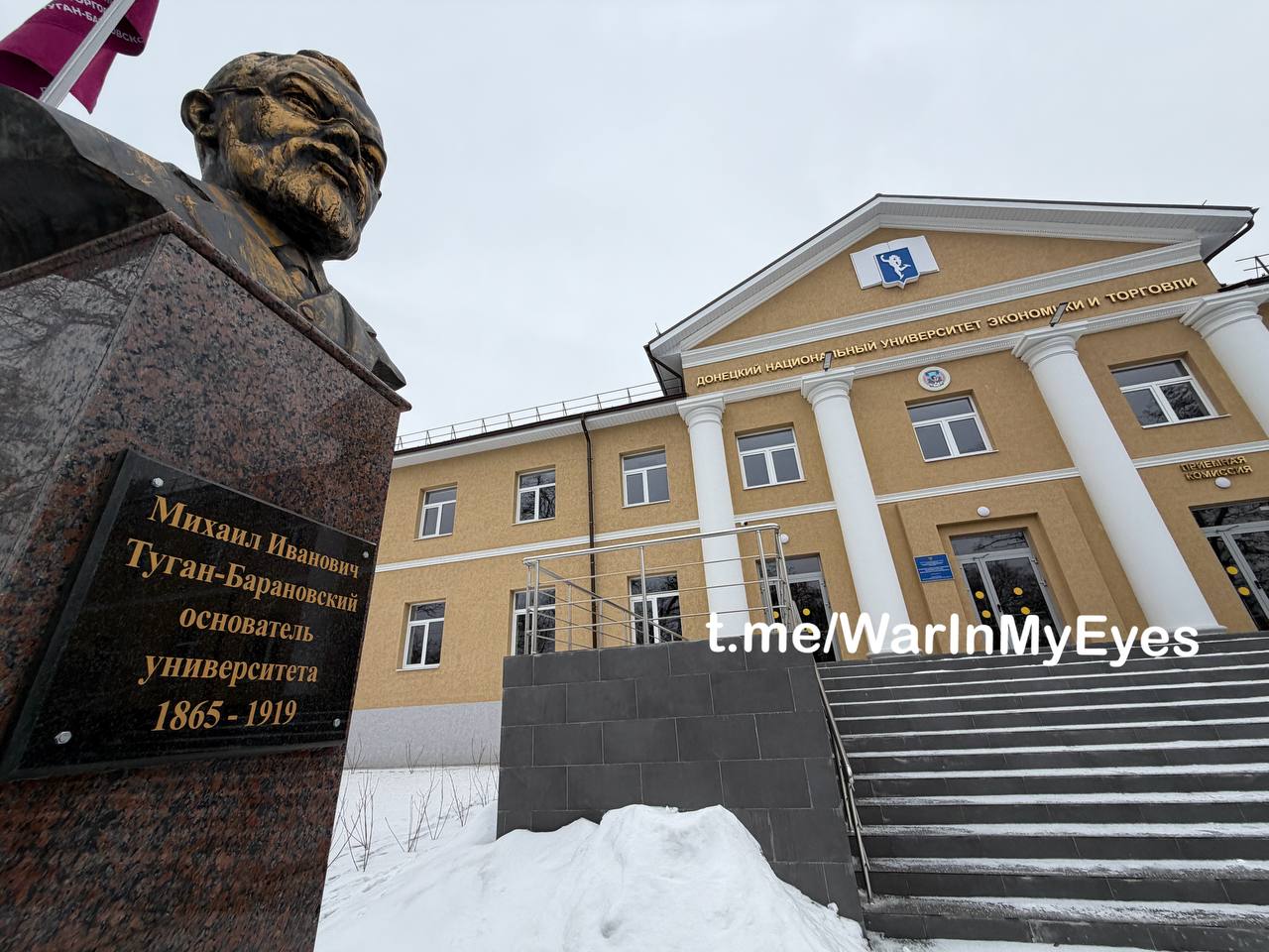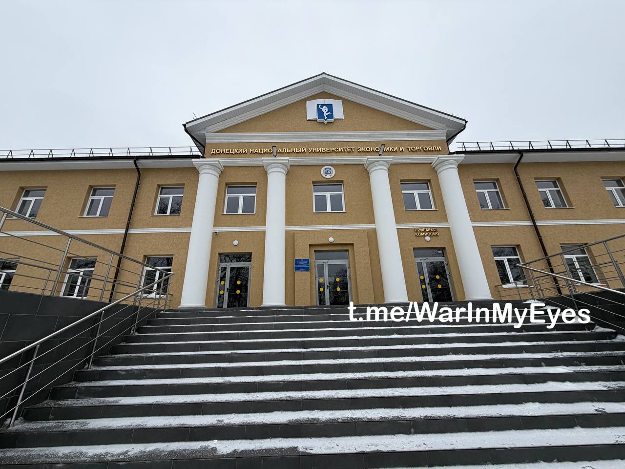 Главный корпус Донецкого Национального Университета Экономики и Торговли им. Туган-Барановского летом 2023 года сразу после прямого попадания ракеты РСЗО HIMARS, и он же в январе 2026 года полностью восстановленный