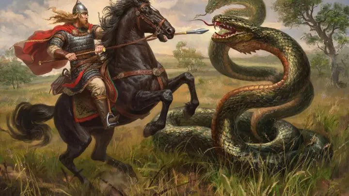 "Я видел, как он бьёт змия в голову огненным копьём, а тело змия было растоптано копытами коня. И только хвост совершал какие-то судорожные и бессмысленные движения".