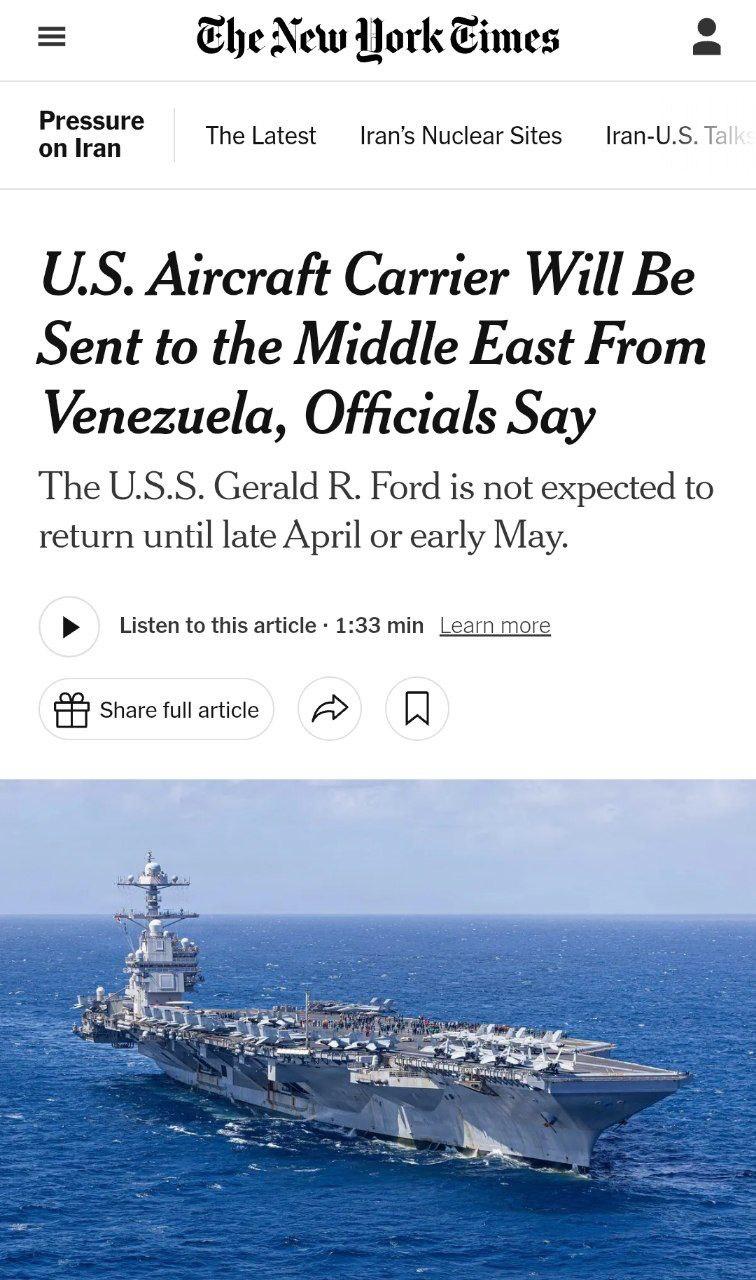 The New York Times пишет, что мощный авианосец USS Gerald R. Ford покинул воды Карибского моря и направился в зону ответственности американского Центрального командования.