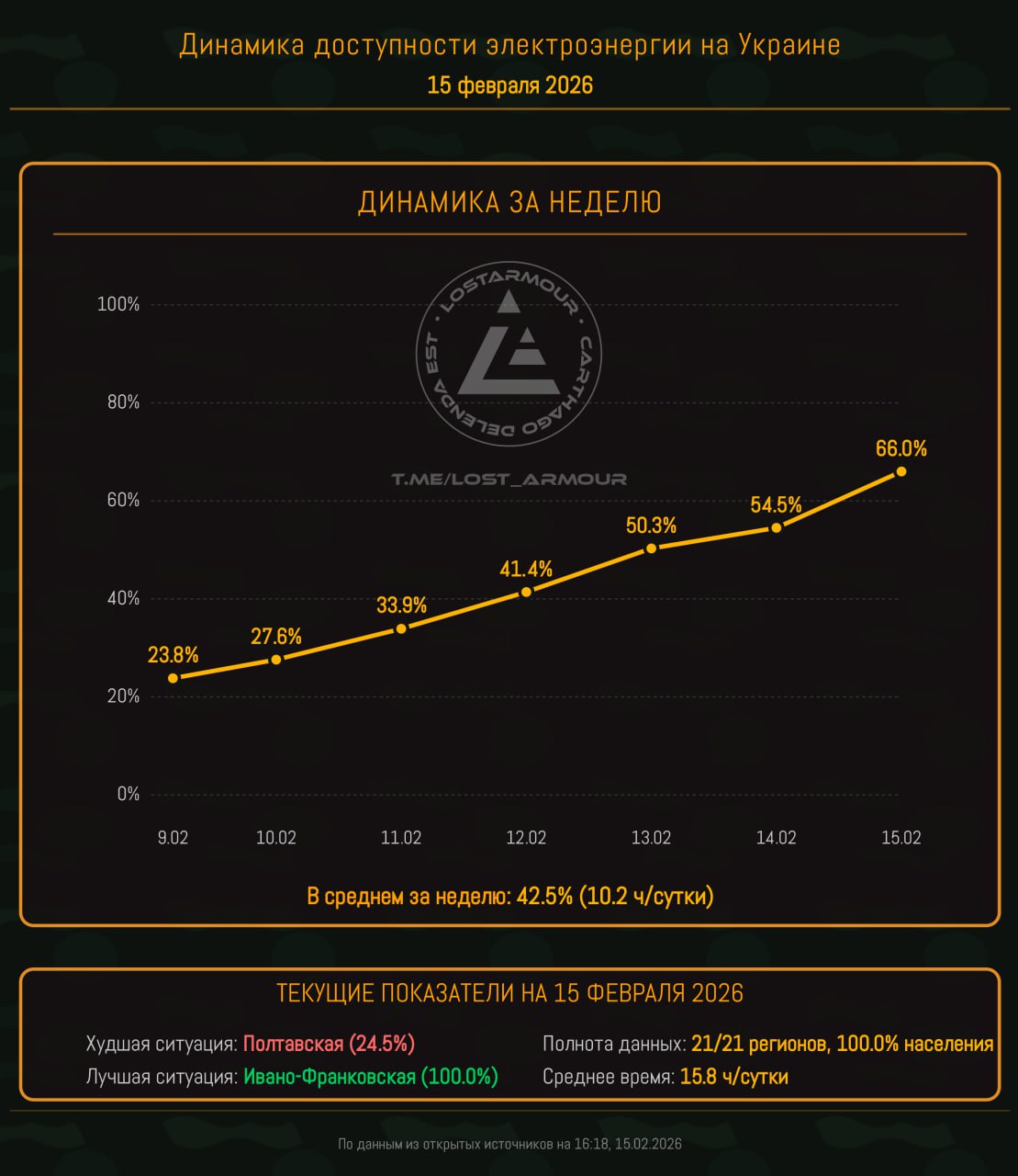 • Среднее время доступности электроэнергии за сутки - 15,8 часов (66%)