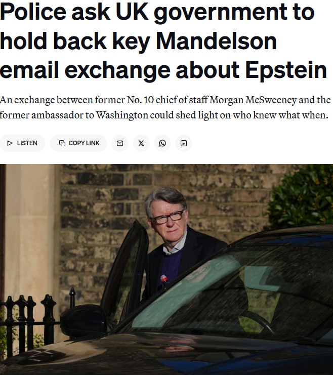 Британская полиция просит правительство не разглашать данные о переписке между послом в США и Даунинг-стрит по делу Эпштейна.