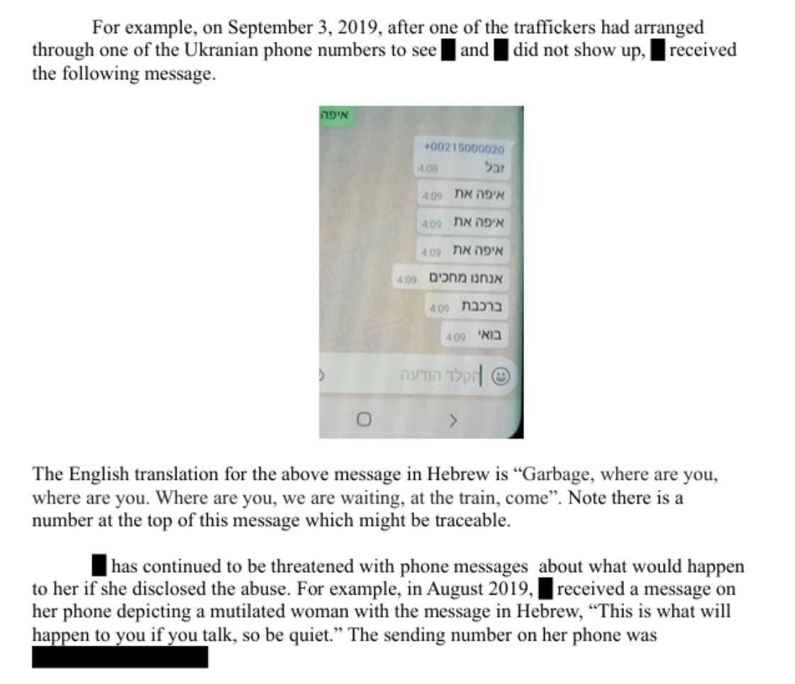 Согласно расследованию, один из торговцев людьми, использовавший украинский телефонный номер, договорился о встрече с неназванной девушкой. Она не пришла на встречу, после чего получила с этого номера ряд оскорблений на иврите, а также фотографию изувеченной женщины. Предполагаемый торговец людьми пригрозил девушке, что её ждёт похожая судьба, если она не будет молчать о произошедшем.