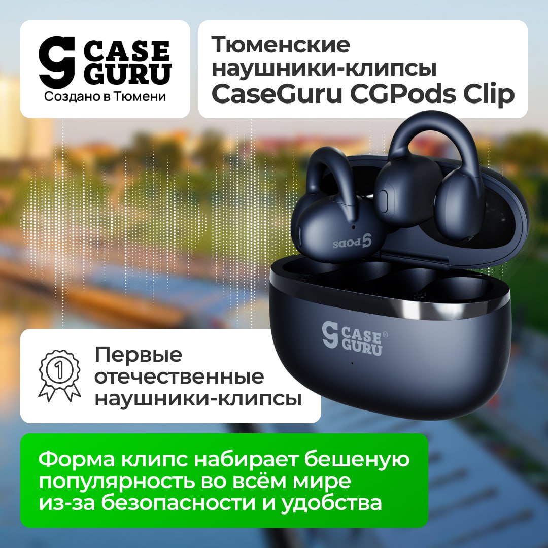 Тюменские CaseGuru CGPods Clip новинка с С-образным креплением открытого типа. Сидят удобнее накладных — подстраиваются под форму уха и запоминают её. Звучат как вакуумные — за счёт направленного звукового потока. Окружающие НЕ слышат вашу музыку.
