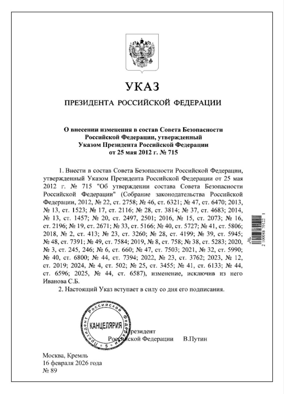 «Внести в состав Совета Безопасности Российской Федерации… изменение, исключив из него Иванова С. Б.»,