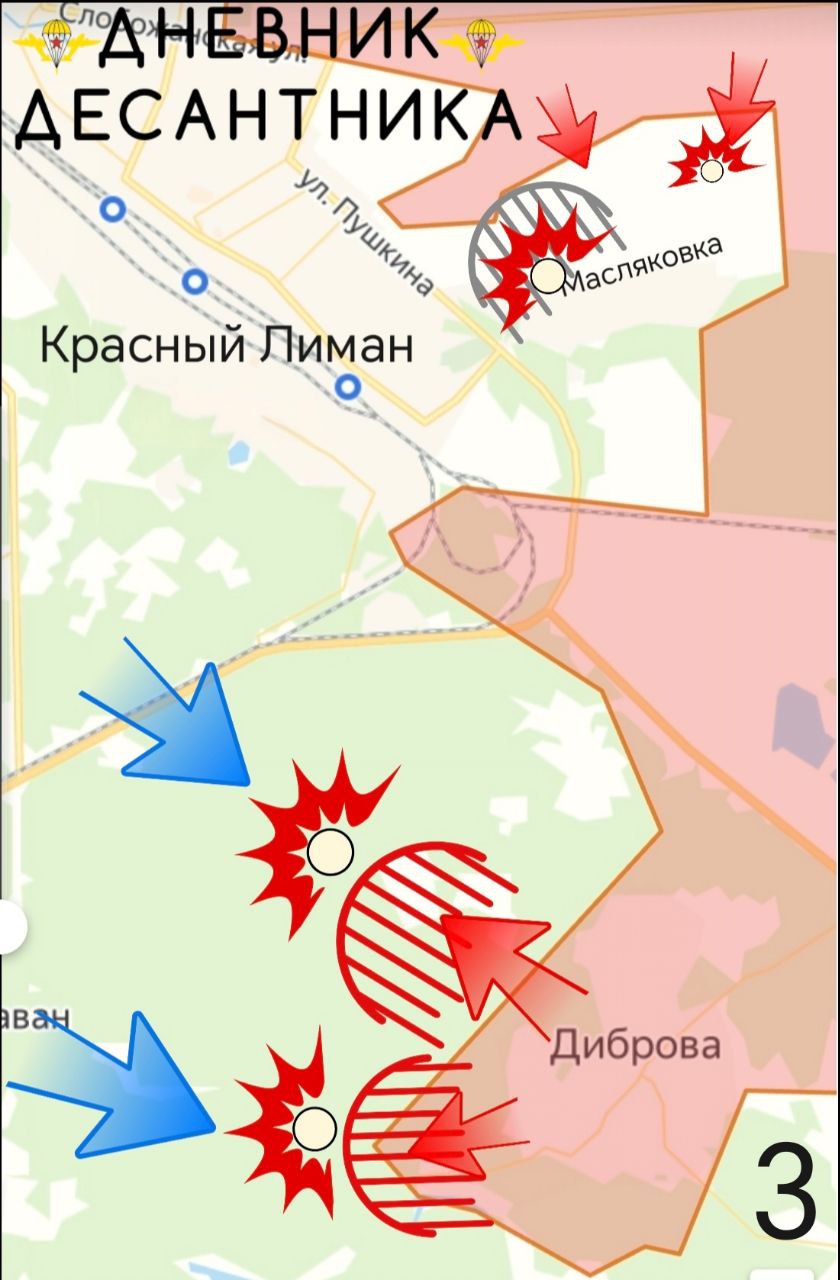 (2) Красный Лиман. В городской черте ВС РФ выбили противника из укрепра и расширили зону контроля в районе переулка Героев Десантников. Также есть продвижение в сторону улицы Советская (Слобожанская), улица Казацкая под нашим контролем.