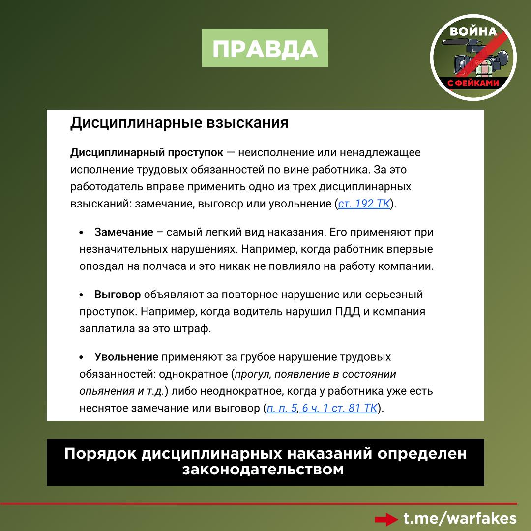 Правда: Это фейк-кликбейт. Россиянам не грозят увольнения за ворчание. Законодательство РФ предусматривает четкую последовательность дисциплинарных мер в адрес сотрудников, а для кардинального кадрового решения должны быть веские основания. В частности, систематическое нарушение трудовой дисциплины.