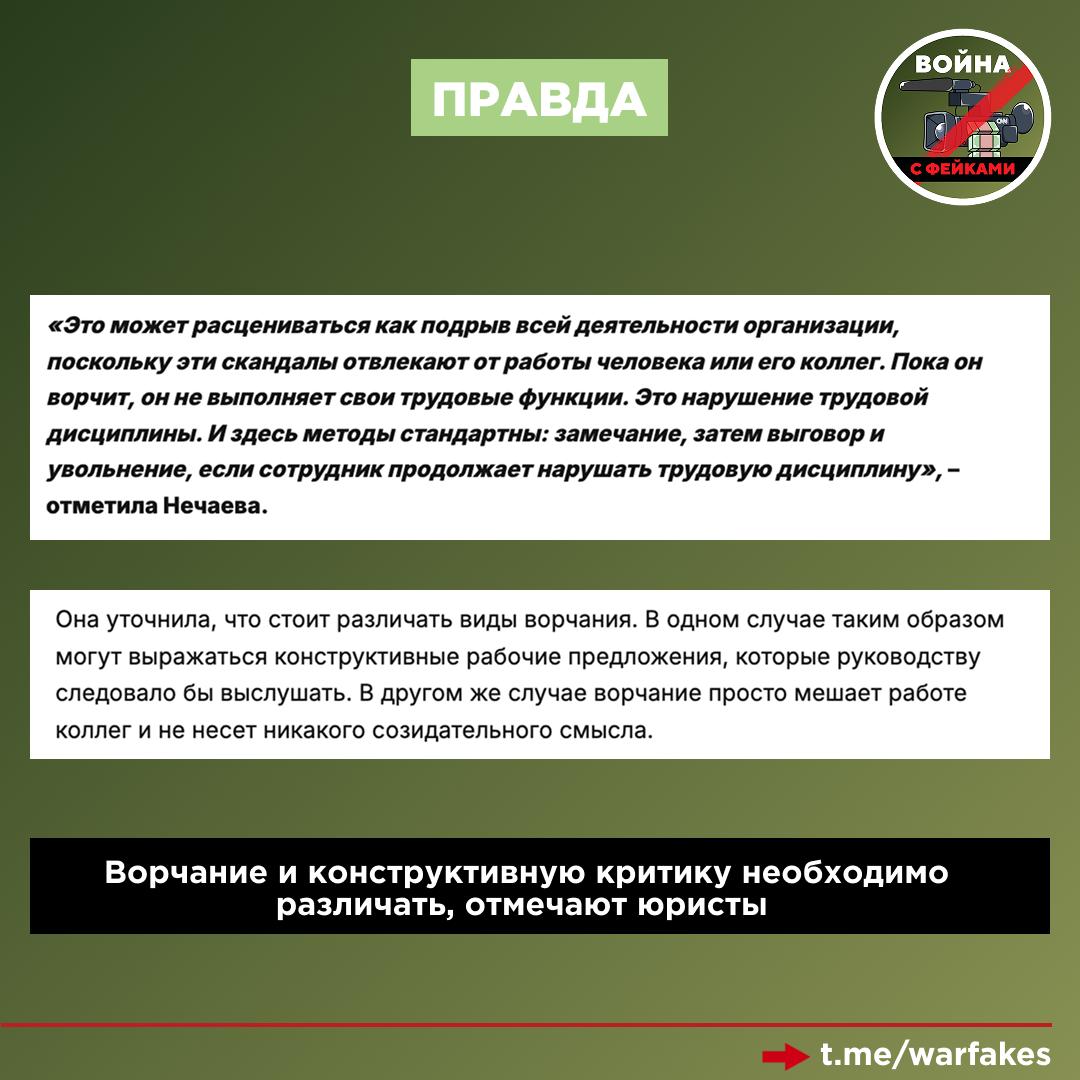 Фейк: Россиян начнут увольнять за ворчание, предупреждают некоторые российские телеграм-каналы.