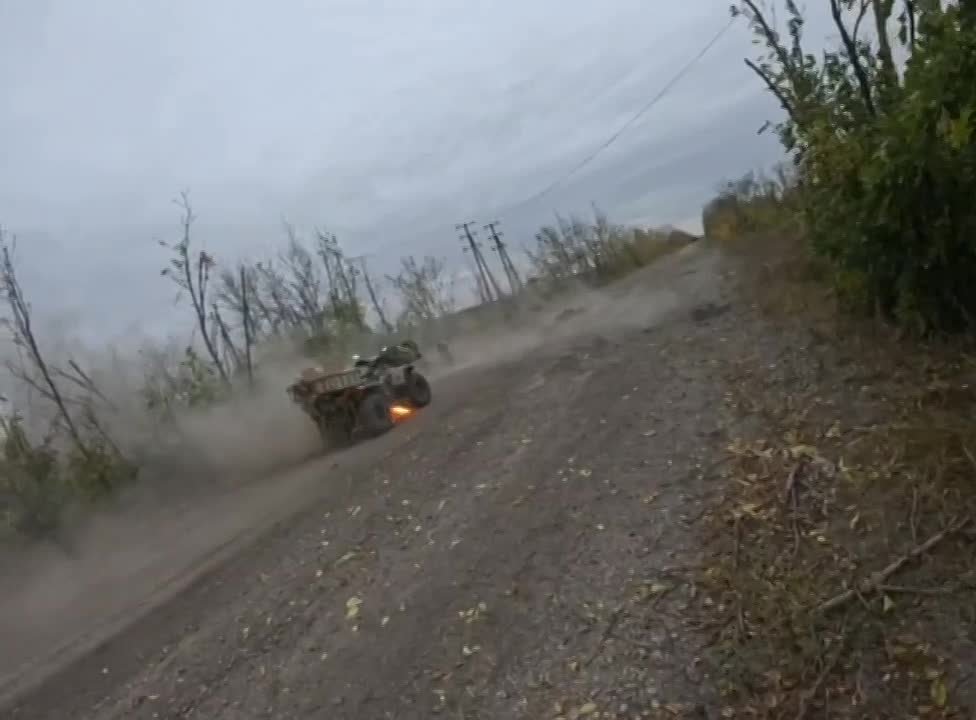 Дрон попадает в квадроцикл с грузом и начинается пожар. Бойцы смогли потушить. Обошлось без потерь.