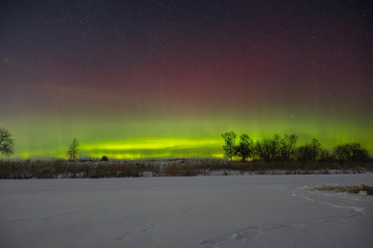 Северное сияние морозной ночью также запечатлели в Приозерском районе (@veryredfox) и на Южном берегу Финского залива (@arsviridova).