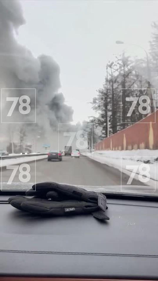 Клубы чёрного дыма поднимаются в небо в районе Всеволожска — горит ангар на шоссе Дорога Жизни.