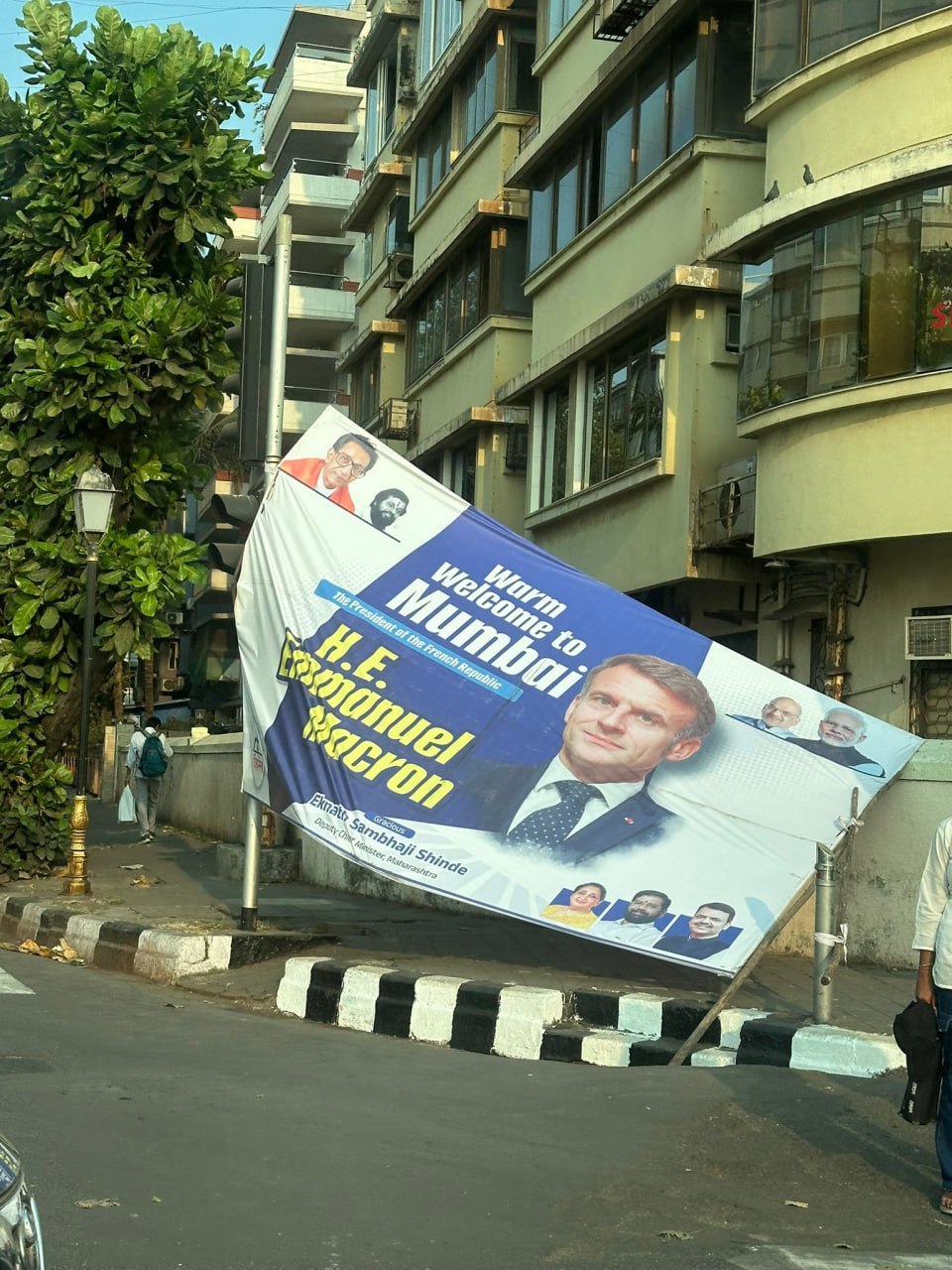 Пока Макрон совершает пробежку по улицами Мумбаи, один баннеров подает знаки