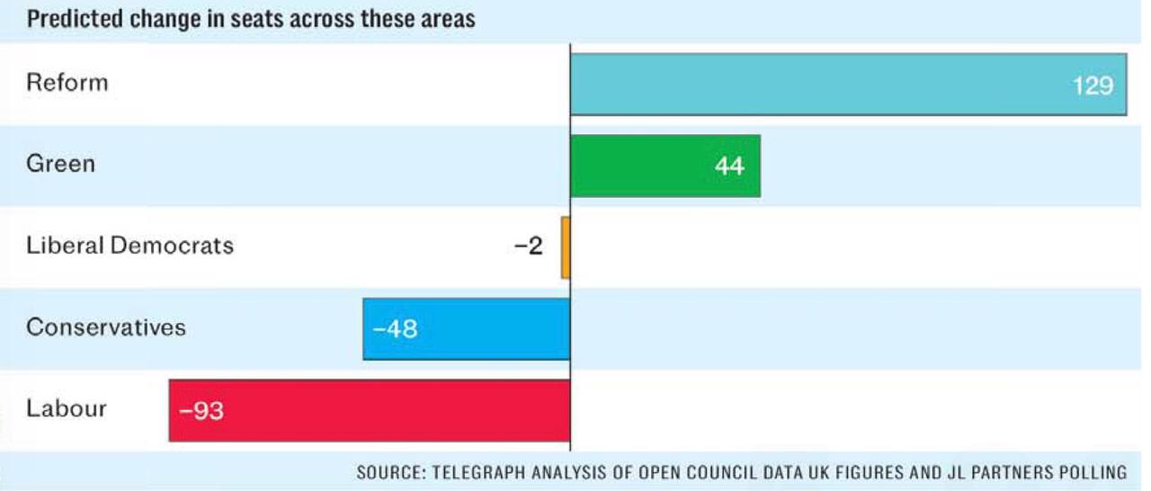 Сегодня The Daily Telegraph публикует анализ опросов по этим округам. Судя по нему, в этих округах лейбористы Стармера теряют 93 депутатских мест, а реформисты Фараджа приобретают 129 мандатов.