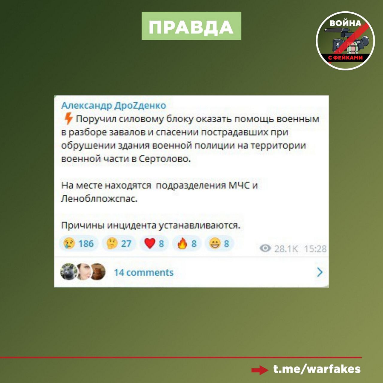 Фейк: В Ленинградской области произошел взрыв, в результате которого обрушилось здание военной полиции. Украинские телеграм-каналы предлагают множество версий о причинах произошедшего.