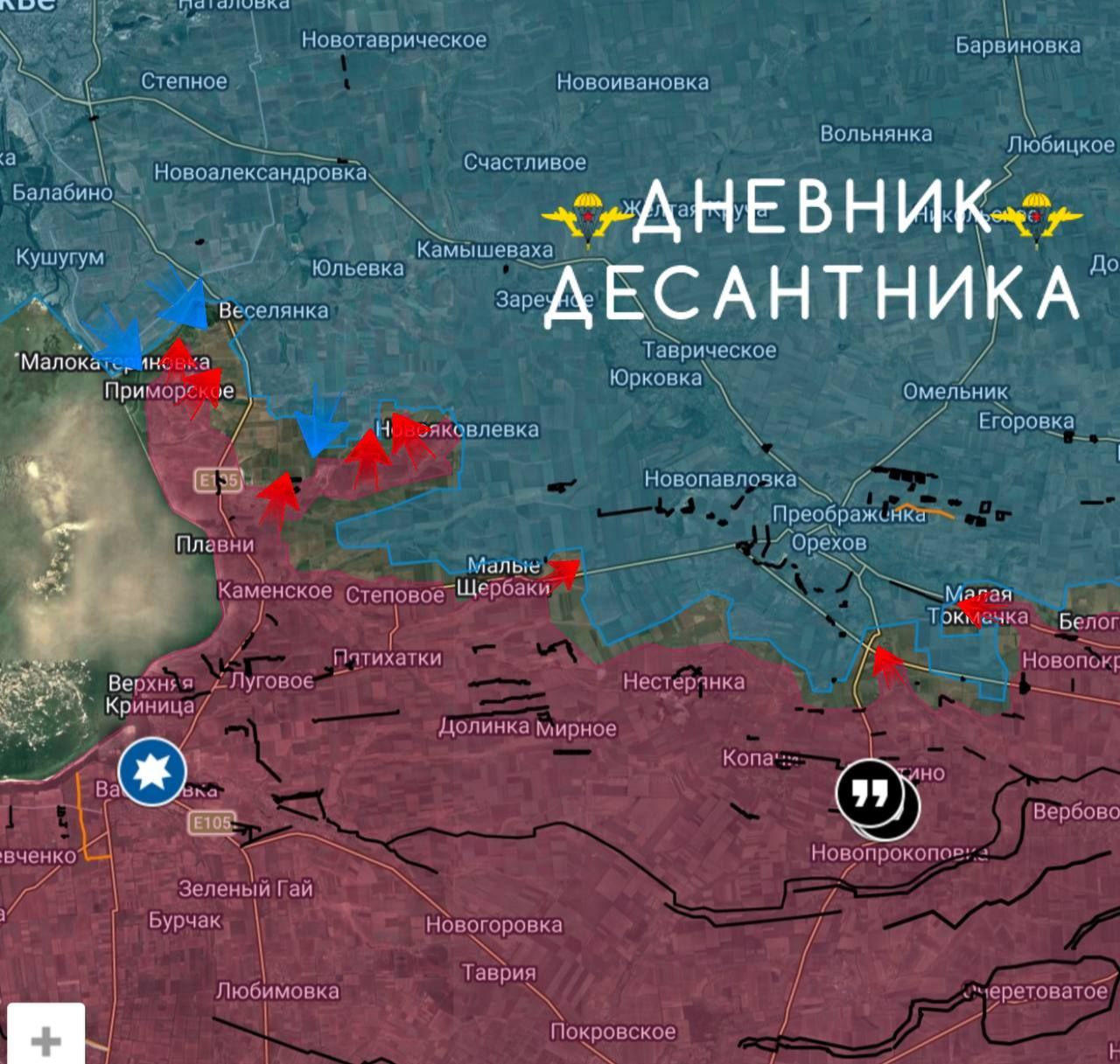 Десантники двигаются на север от населенного пункта, линия фронта не ровная и позиции ВС РФ и ВСУ смешанные, мы в свою очередь контролируем каждую нашу штурмовую группу ВДВ. Противник пытается огрызаться и контратаковать наши позиции. Два дня назад вечером враг пытался на 2х БМ машинах заехать на наши позиции с живой силой в результате чего был успешно уничтожен.