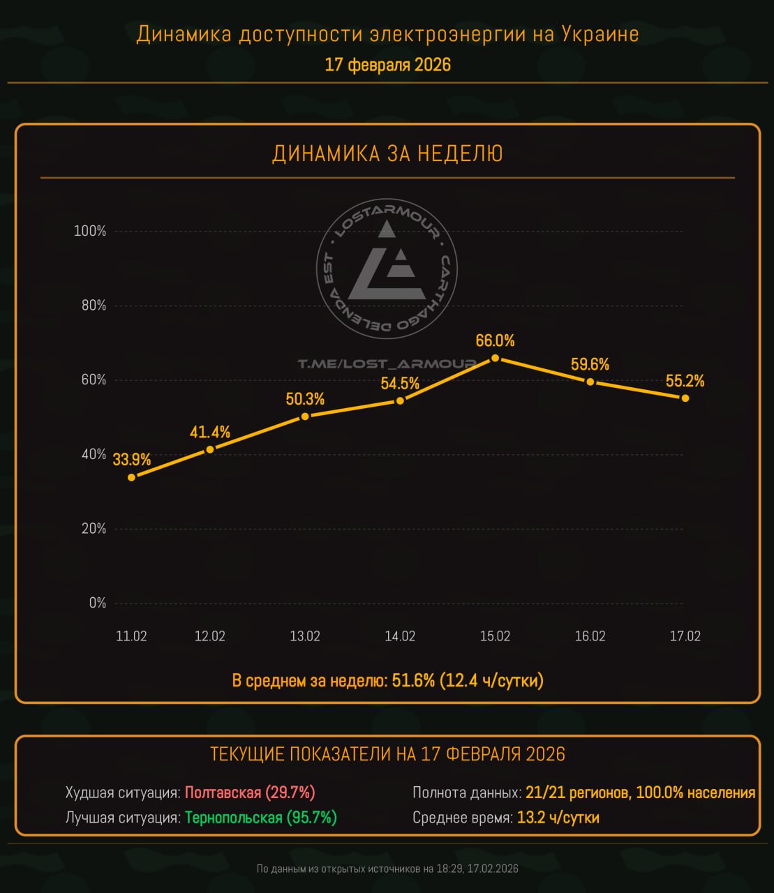 Инфографика доступности электроэнергии на территории Украины по областям на 17 февраля 2026.