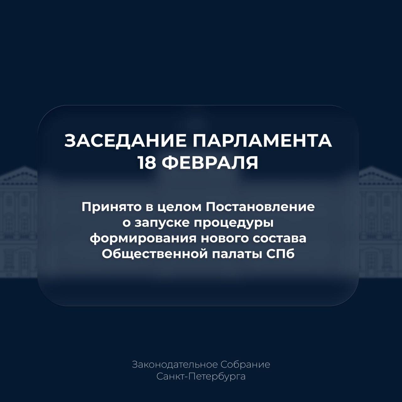 Депутаты приняли в целом Постановление о запуске процедуры формирования нового состава Общественной палаты Санкт-Петербурга.
