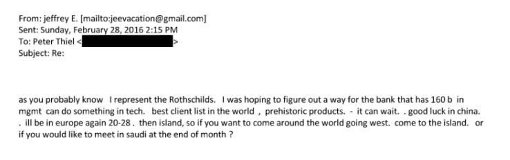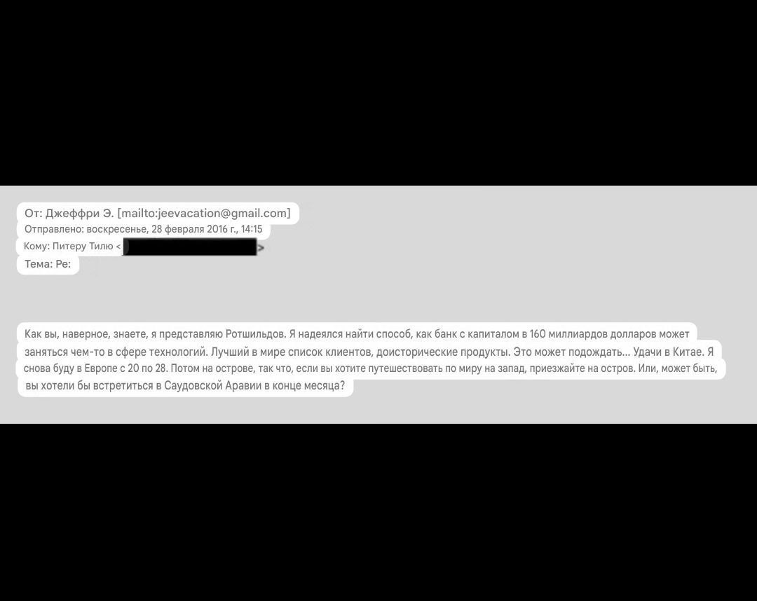 Это послание Джеффри Эпштейна, адресованное сооснователю PayPal и Palantir Питеру Тилю, нашли в обнародованных документах.