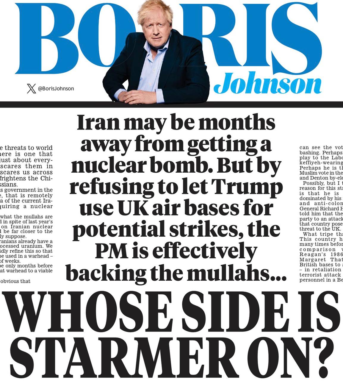 Бориска Джонсон сегодня со страниц Daily Mail обличает Стармера в том, что тот якобы поддерживает тегеранский режим, отказываясь предоставлять Трампу британские базы для ударов по Ирану. Лохматый лицемер поясняет: