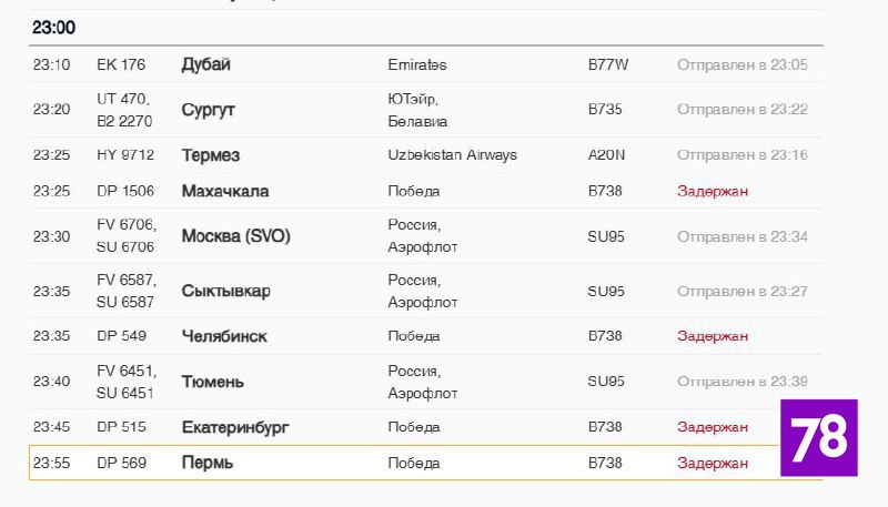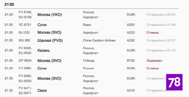 В Пулково задержаны на вылет рейсы в Екатеринбург, Казань, Махачкалу, Москву, Пермь и Челябинск. Причиной стало позднее прибытие воздушных судов.