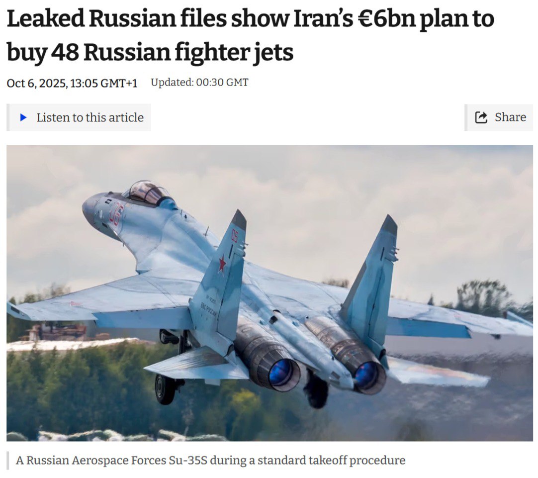 Military Watch Magazine отметил рейсы российского Ил-76 в Тегеран и связал это с поставками Су-35. Утечки о таких закупках появились в западных СМИ ещё в октябре прошлого года, якобы из документов от хакерской группы «Black Mirror». Сделка оценивалась в $6 млрд на поставку 48 Су-35 в 2026–2028 годах.