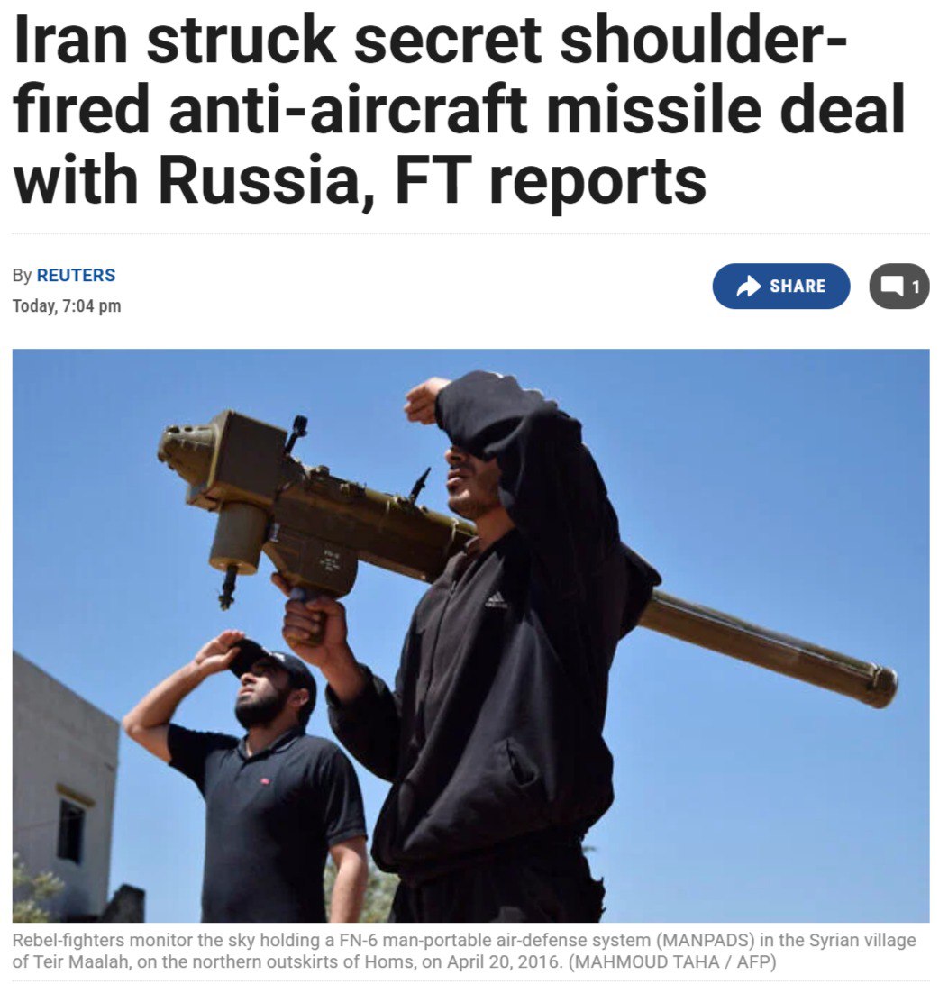 Сегодня Financial Times со ссылкой на источники и текст некоего соглашения сообщила, что Иран заключил секретную сделку с Россией на €500 млн за 500 переносных зенитно-ракетных комплексов "Верба" и 2500 ракет к ним.