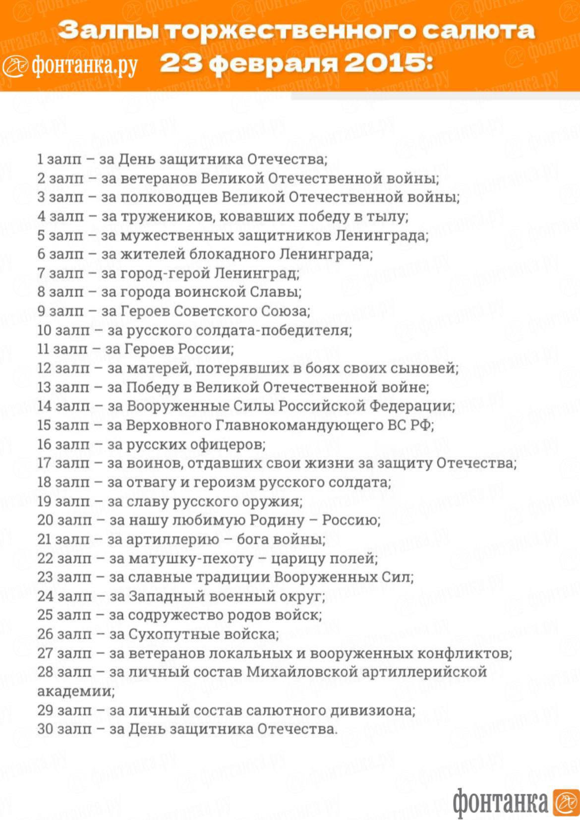 Их посвящают конкретным людям и событиям. Вот как выглядел список залпов 2026-го года. На второй карточке — список 2015-го года.Telegram | Все каналы «Фонтанки» | Max
