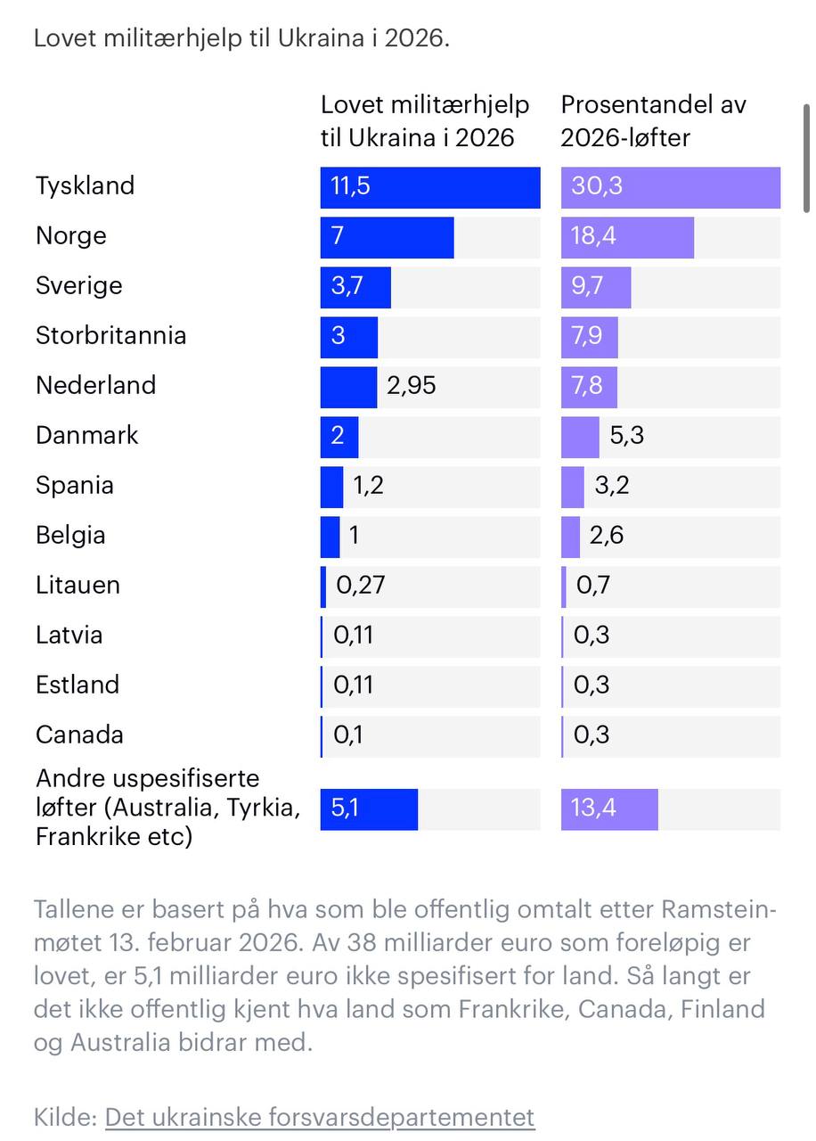 По данным газеты Aftenposten, норвежские системы ПВО NASAMS и истребители F-16 уже помогли украинским военным сбить более 3600 российских воздушных целей. Сейчас на долю Норвегии приходится около 20% всей западной военной поддержки, что делает её третьим крупнейшим донором после Германии.