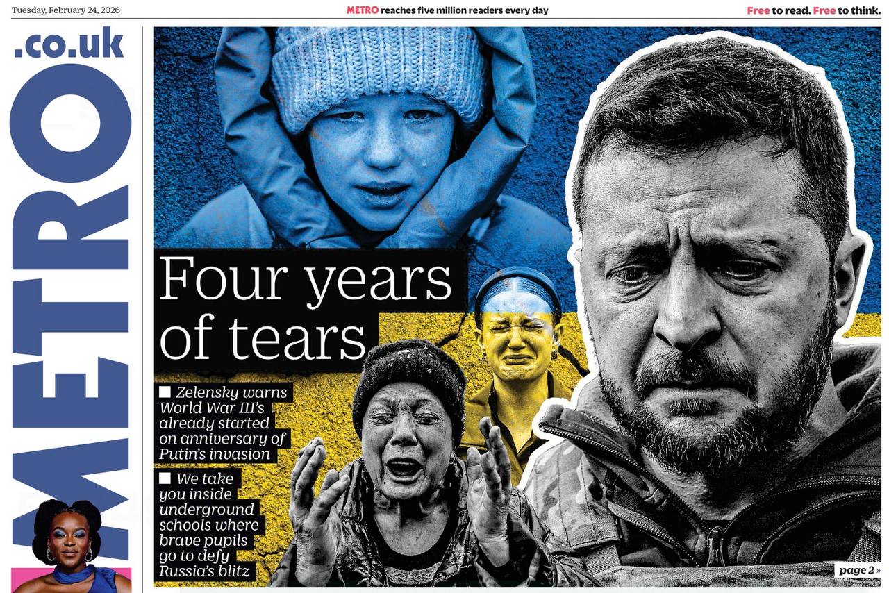 Первая полоса сегодняшней британской газеты Metro: «Четыре года слез». Основной материал - репортаж о школьниках Харькова, которые проводят уроки в бункере.