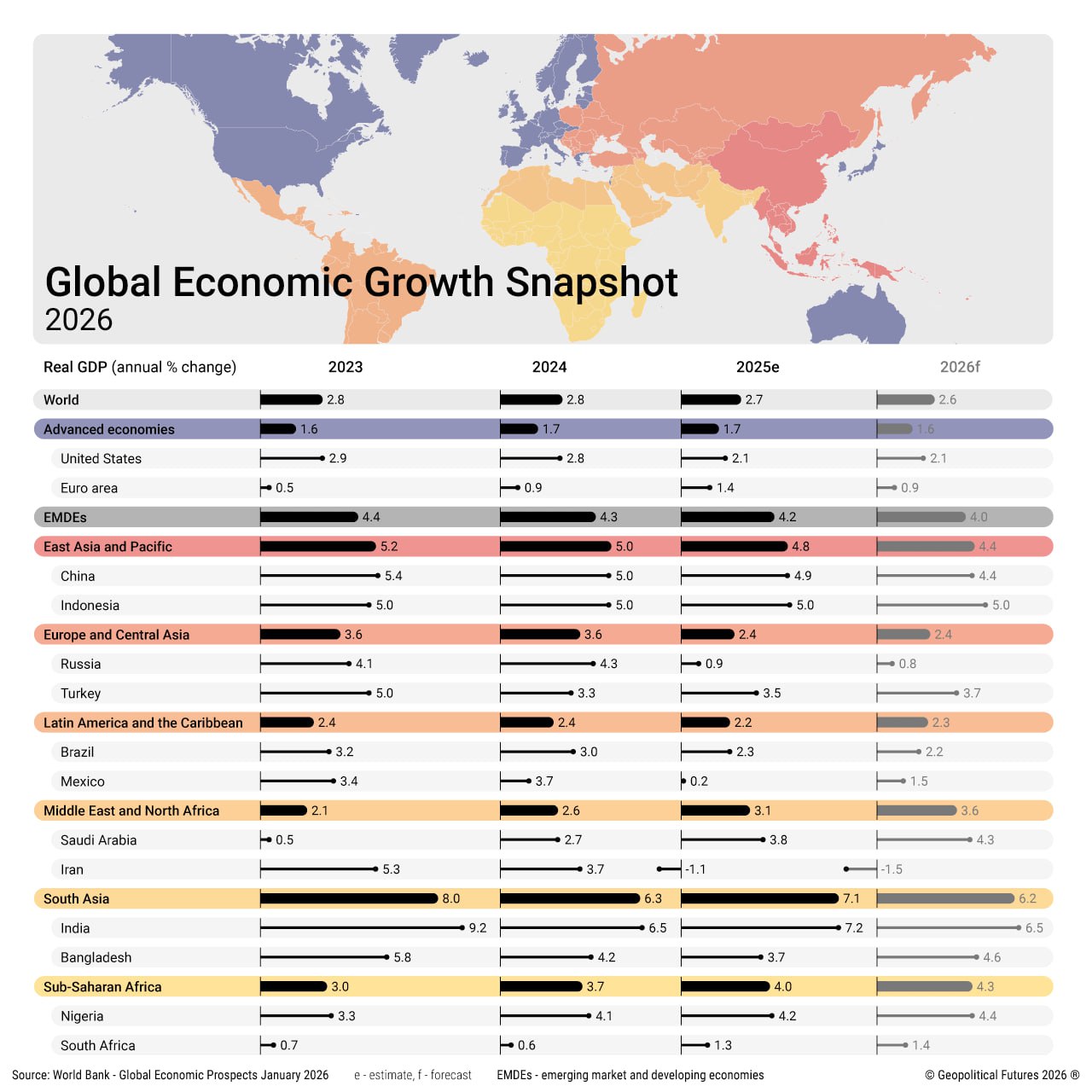 Согласно докладу Всемирного банка, в 2025 году мировая экономика в целом ощущала себя неплохо, чему способствовал всеобщий рост торговли — до повышения тарифов в США. Однако никаких признаков того, что эта обнадеживающая тенденция сохранится в 2026 году, нет. По мере ослабления благоприятных факторов, поддерживающих крупнейшие экономики мира, на первый план выйдет сдерживающее влияние новых торговых барьеров.