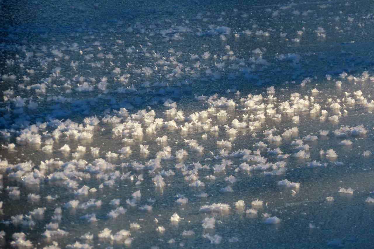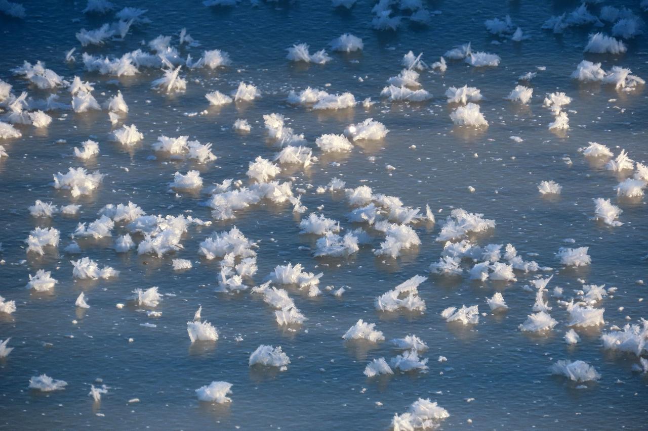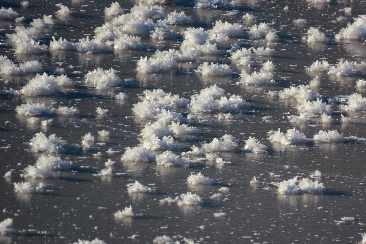 Водяной пар от теплой воды просачивается через лед, скапливается у поверхности и при резком охлаждении превращается в кристаллы, которые растут буквально за секунды. Обычно такое явление можно наблюдать в средних широтах в начале зимы.