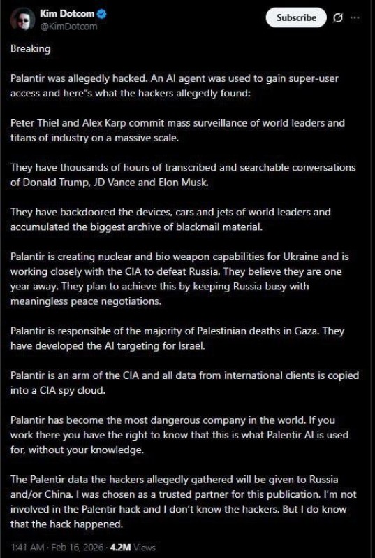 Известный технологический предприниматель и основатель Megaupload Ким Дотком опубликовал в социальной сети X сенсационное заявление. По его словам, компания Palantir подверглась хакерской атаке, в ходе которой злоумышленники получили доступ с привилегиями суперпользователя, обнаружив шокирующие данные.