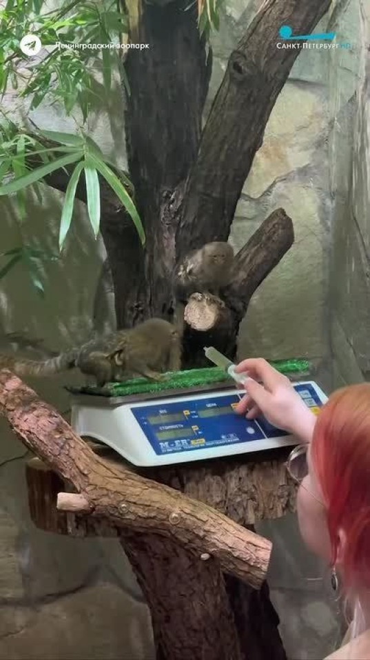 Карликовые игрунки Лили и Полумна из Ленинградского зоопарка научились спокойно взвешиваться — без стресса, за лакомство.