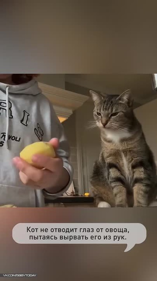 В качестве дани полосатому подходит всё, даже сырой картофель. Он хочет быть в курсе всего, что происходит на кухне и берёт контроль над процессом в свои лапы.