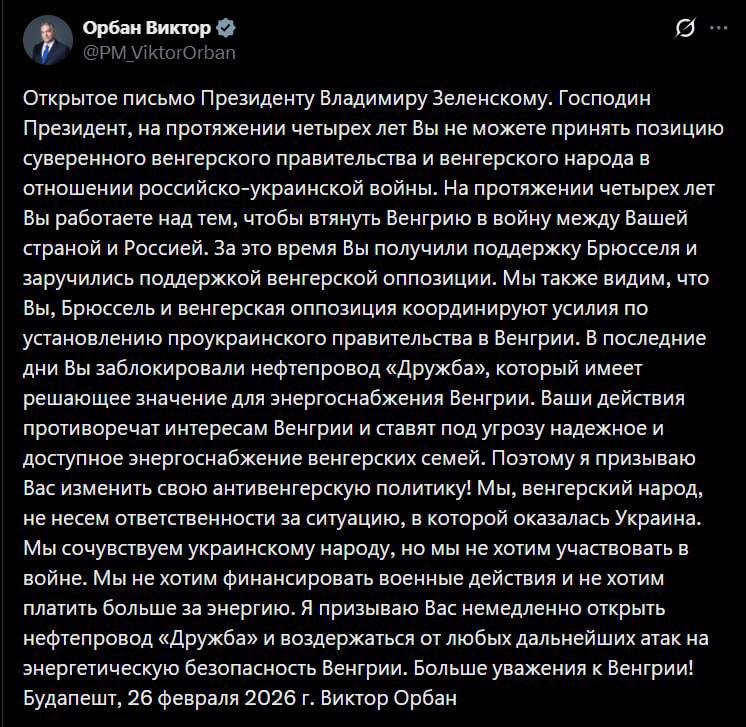 Венгерский премьер Орбан опубликовал в соцсети обращение к Зеленскому: