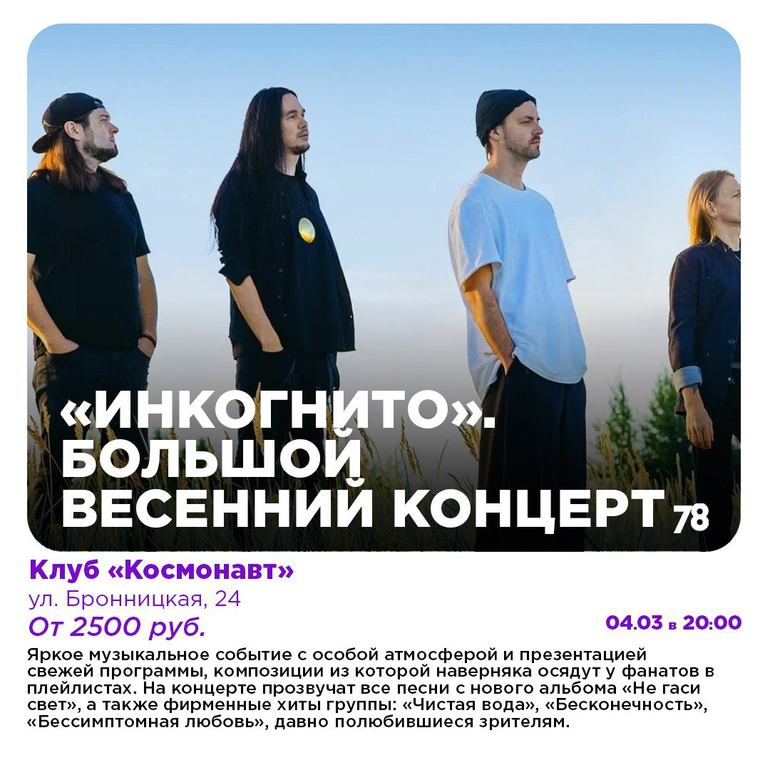 Зарядиться правильным настроением помогут согревающие сердце концерты «Интонации» и «Инкогнито». Полюбившиеся многим песни станут отличными саундтреками к прогулкам под выглянувшим солнцем.