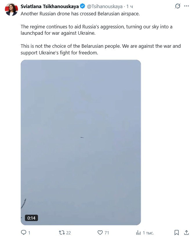 ‘Ещё один российский беспилотник пересёк воздушное пространство Белоруссии. Мы против войны и поддерживаем борьбу Украины за свободу’.