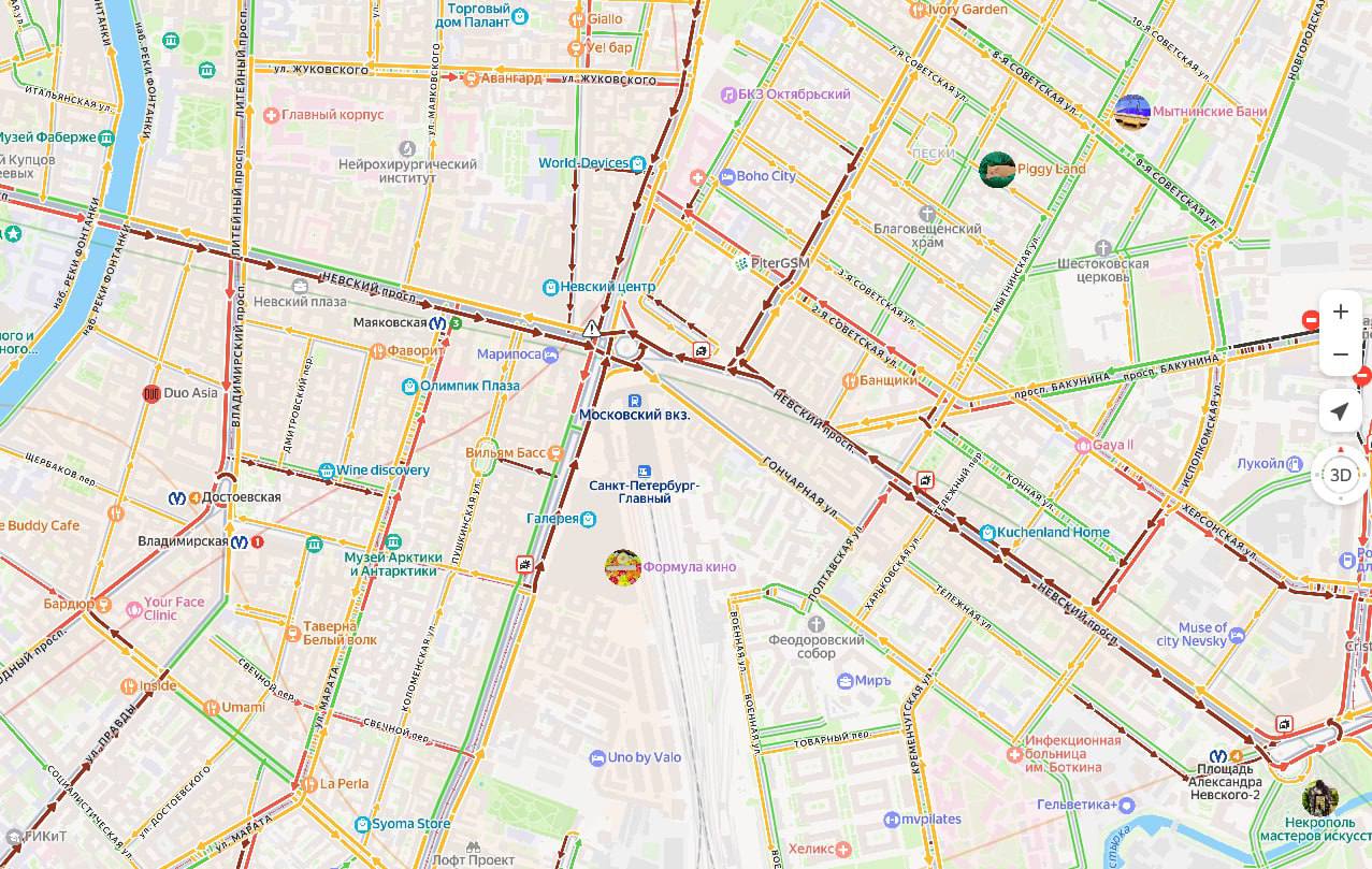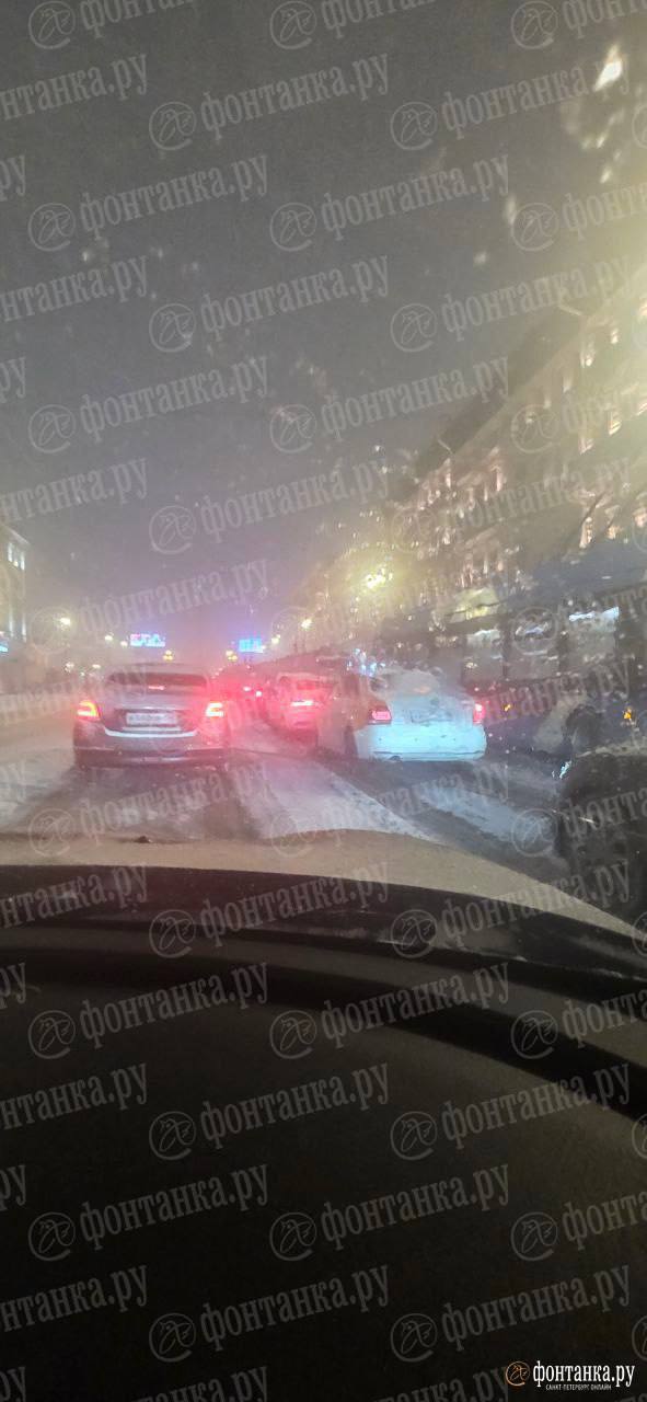 Бордовую пробку на пересечении Лиговского и Невского проспектов собрали метель и неработающий светофор.
