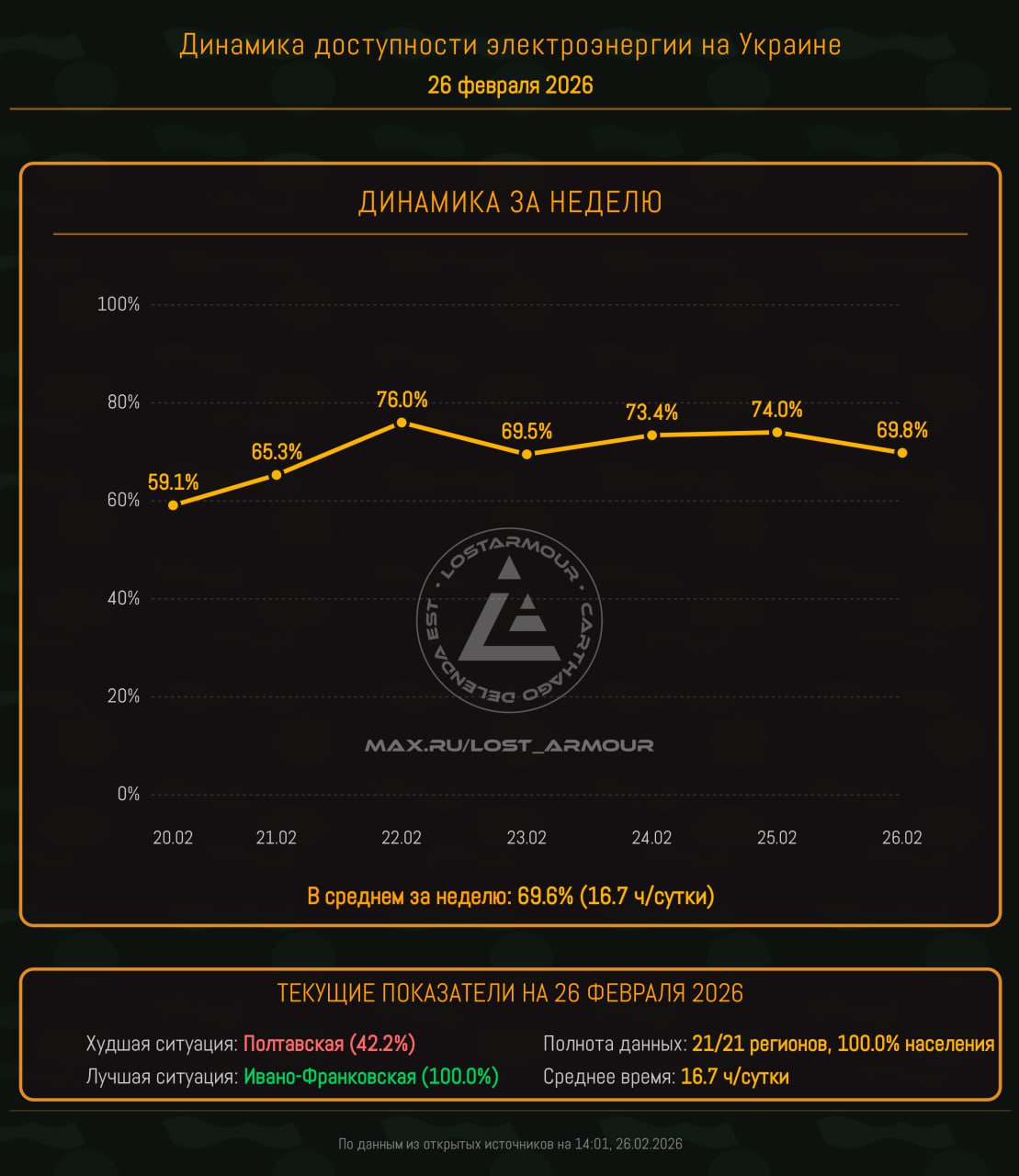 Инфографика доступности электроэнергии на территории Украины по областям на 26 февраля 2026.