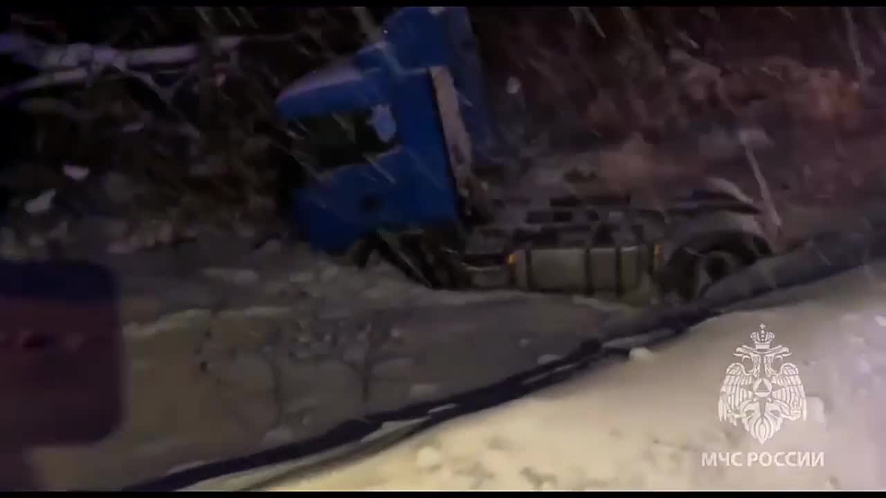 От удара большегруз улетел в кювет. Водитель и пассажир легковушки скончались на месте. Дальнобойщика зажало в кабине. Его достают спасатели.