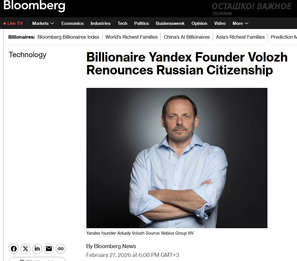 Сооснователь компании «Яндекс» Аркадий Волож перестал быть гражданином России. По данным Bloomberg, подтверждение об утрате гражданства он получил на этой неделе. Решение связано с фокусом на развитии голландской неооблачной компании Nebius, в которой семья бизнесмена контролирует около 13% акций.