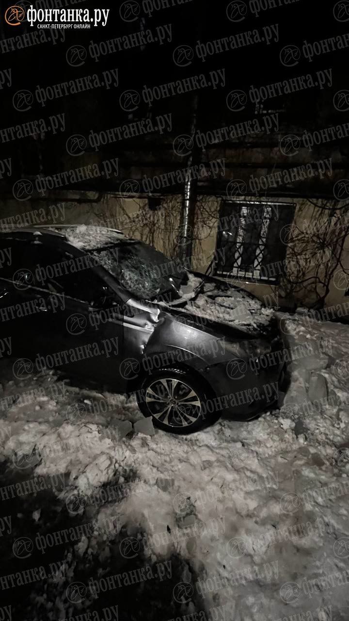 Глыбы льда приплющили «Тойоту» во дворе на 7-й линии В.О. Крыша, капот, стекла – оттепель не пощадила ничего.