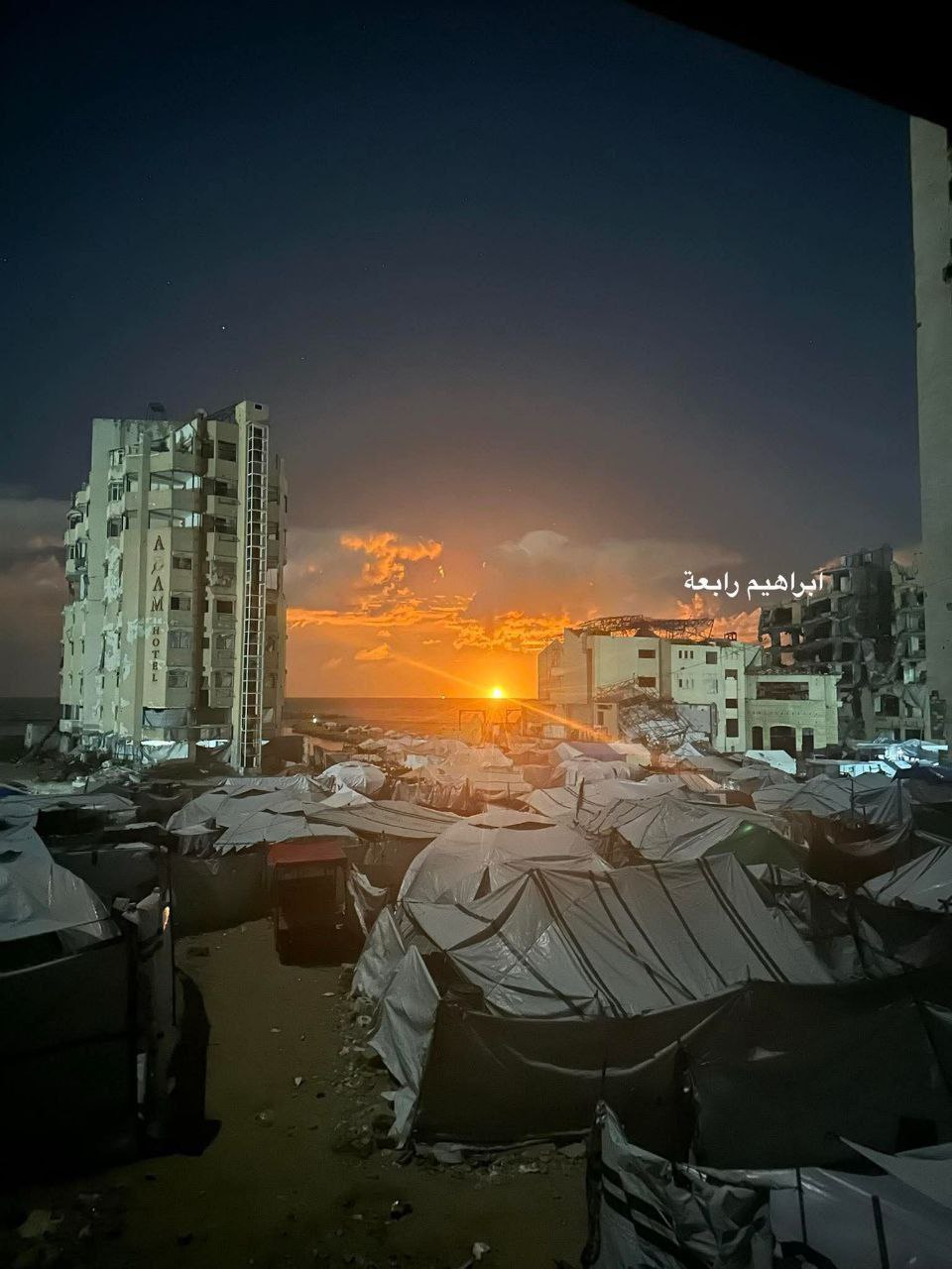 Палестинские беженцы ютящиеся в палатках в Секторе Газа наблюдают за горящий кораблем у побережья Газы.
