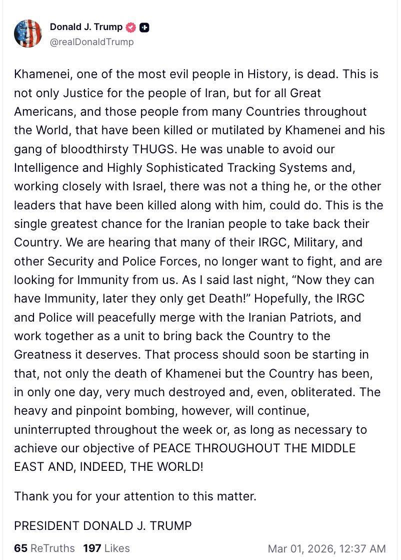 Пора вызывать санитаровОчередной перл от Трампа:«Массированные и точечные бомбардировки будут продолжаться непрерывно в течение всей недели или столько, сколько потребуется для достижения нашей цели — мира на всём Ближнем Востоке».Мы, конечно...