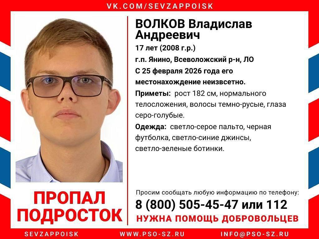 Информации о местонахождении Владислава Волкова нет с 25 февраля текущего года. Об этом сообщил поисково-спасательный отряд «Северо-Запад».