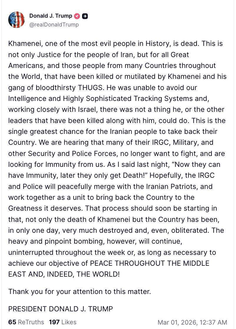 «Хаменеи, один из самых злобных людей в истории, мёртв. Это не только справедливость для народа Ирана, но и для всех великих американцев и людей из многих стран мира, убитых или изувеченных Хаменеи и его бандой кровожадных головорезов. Он не смог избежать нашей разведки и высокотехнологичных систем слежения, и, работая в тесном сотрудничестве с Израилем, он или другие лидеры, убитые вместе с ним, ничего не могли сделать. Это величайший шанс для иранского народа вернуть свою страну. Мы слышим, что многие из их Корпуса стражей исламской революции, армии и других сил безопасности и полиции больше не хотят воевать и ищут у нас иммунитета. Как я сказал вчера вечером: «Сейчас они могут получить иммунитет, а потом их ждет только смерть!» Надеюсь, Корпус стражей исламской революции и полиция мирно объединятся с иранскими патриотами и будут работать вместе как единое целое, чтобы вернуть стране то величие, которого она заслуживает. Этот процесс должен вскоре начаться, поскольку не только Хаменеи погиб, но и вся страна была за один день практически полностью разрушена и даже стерта с лица земли. Однако массированные и точечные бомбардировки будут продолжаться непрерывно в течение всей недели или столько, сколько потребуется для достижения нашей цели – МИРА НА ВСЕМ БЛИЖНЕМ ВОСТОКЕ И, В КОНЕЧНОМ СМЫСЛЕ, ВО ВСЕМ МИРЕ!»